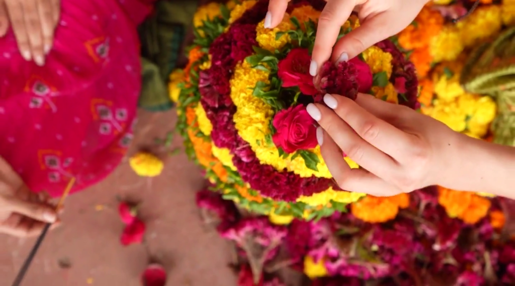 These flowers are arranged without cutting them with knives or scissors, keeping the festival eco-friendly and natural.